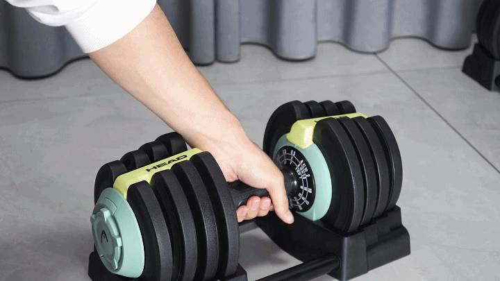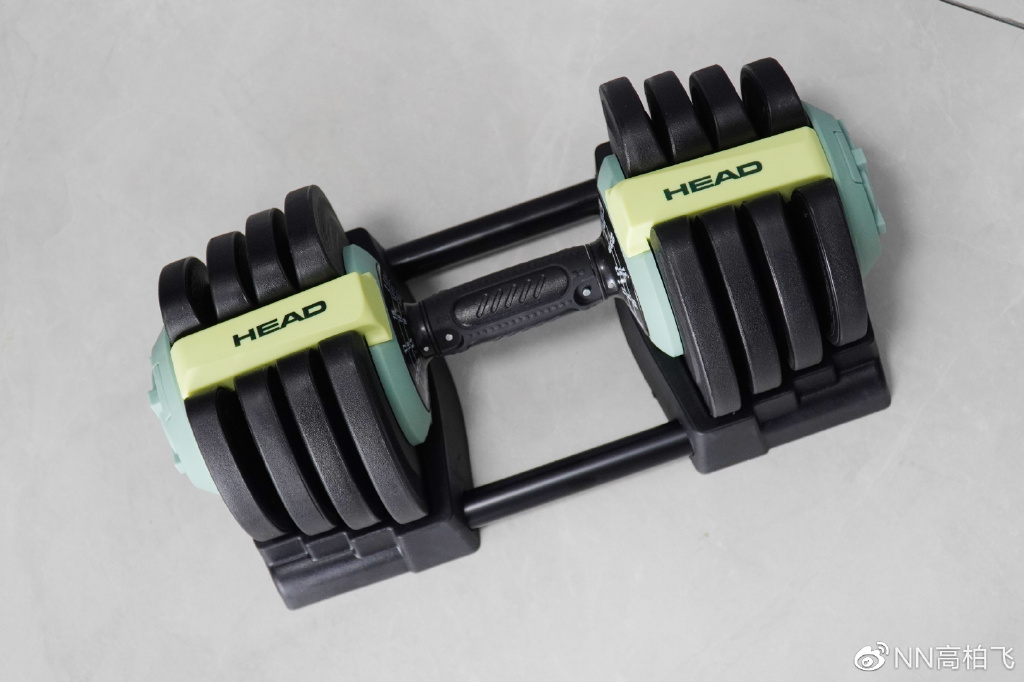 但如果你使用的是海德三合一可调节哑铃,那就方便多了,海德三合一可调节哑铃采用了机械连接结构,所有的铃片都是可以快拆的,只要拧动握把,就会自动调整到标注的重量处,选定的铃片会被留在哑铃上,而没有被选中的铃片则会留在底座上。整个操作过程无需动手,只要手腕轻轻一拧就行了。