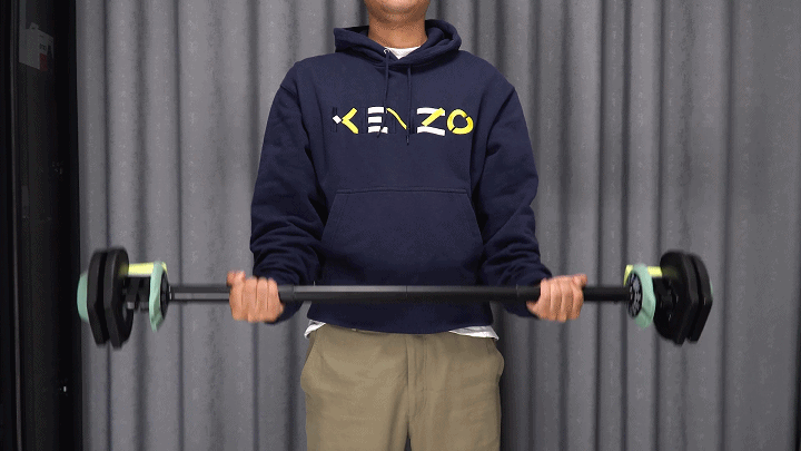 在类似的操作下,海德三合一可调节哑铃还可以变成杠铃,只不过此时的短握把变成了两根连接起来的长握把,通过锁止结构和穿销同时固定,方便的同时又兼顾了安全性。