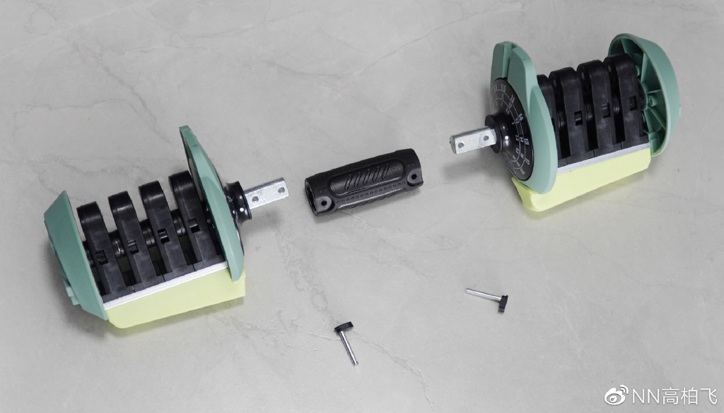 除了作为哑铃使用之外,海德三合一可调节哑铃还可以通过连接杆的更换变成壶铃甚至杠铃,这才是我觉得最神奇的地方。在日常的身体锻炼中,哑铃主要用于肌肉训练,壶铃用于提升身体爆发力,杠铃则是用于提升核心力量,三种工具看似大同小异,其实锻炼方法以及效果完全不同,组合起来可以对身体中的大部分肌肉群进行有效训练。但很少有人会一次购买这三款运动器材,第一是金钱耗费不少,第二是实在太占空间。海德三合一可调节哑铃就很好的解决了这个问题。