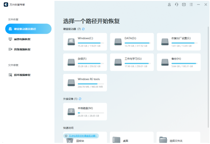 万兴恢复专家除了电脑回收站数据恢复以外,还可以对硬盘驱动器、外部磁盘、固态硬盘、U盘、SD卡、储存卡、摄像机、数码照相机、音乐播放器、视频播放器等进行恢复,方法也非常的简单方便。