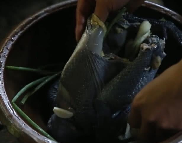 图片来自于网络,如有侵权请告知删除这只乌鸡在被小哥洗干净后用各种调味料腌制了一番,里面有花椒、八角、生姜、葱、生抽等等进行腌制。这本来就黑的乌鸡被腌制过后仿佛又更加黑了,这只鸡被小哥腌制了足足一小时,再用这芭蕉叶把这乌鸡包裹住,再用刚才取来的泥土给糊在这荷叶上。