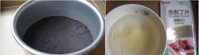 1、提前将黄油隔热水溶化成液体,将奥利奥饼干碎装入保鲜袋中,用擀面棍擀成粉末状或者用研磨机研成粉末,然后将黄油倒入奥利奥饼干粉末中搅拌好,再倒入6寸活底蛋糕模中,压平压紧实,在手中套个保鲜袋,用手压,感觉这样压得会更好一些,放冰箱冷藏备用。2、吉利丁片用冰水或者凉开水泡软备用。