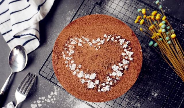 11、将冷藏好的蛋糕取出,用电吹风围着蛋糕模吹一圈,即可轻松脱模。在上面过筛一些可可粉,还可以在上面放一张图案板,过筛糖粉装饰一番。这个慕斯蛋糕的做法你学会了吗?有什么不明白之处可以聊一下小编哟。