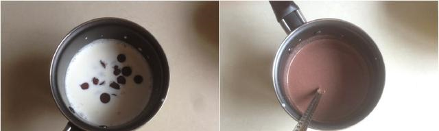 3、牛奶加温到50度的时候,把巧克力豆倒入。4、拌至全部融化。