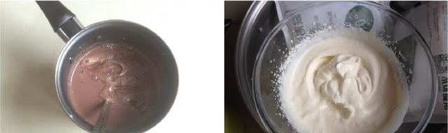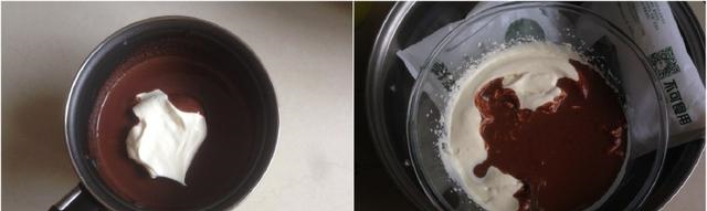 7、取少部分打发好的淡奶油,放入到已经冷藏过的巧克力液中拌均匀。8、然后将巧克力慕斯液倒入淡奶油中。