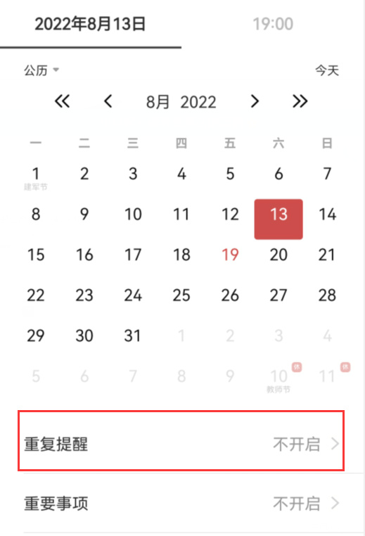 此时,您可点击“自定义”进入“时间提醒”界面,选择提醒自己的时间和日期。同时,点击日历下方的“重复提醒”,将提醒方式选择为“按月”点击确定。