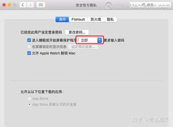 点击系统偏好设置 – 安全性与隐私,在“通用”标签下勾选“进入睡眠或者开始屏幕保护程序 X 分钟后要求输入密码”。如果想要直接锁屏,那就选择“立即”。