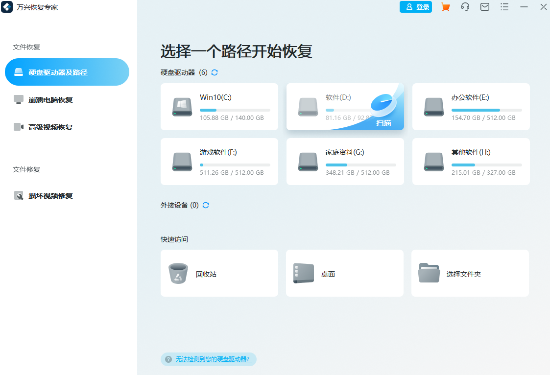 下载并打开万兴恢复专家,印入我们眼帘的是左侧功能区域的目录,具体的有:硬盘驱动器及路径、崩溃电脑恢复高级视频恢复和损坏视频修复。根据需求选择相对应的功能即可。紧接着选择丢失数据所对应的分区,直接点击右下角的开始按钮。而后万兴恢复专家会针对选定区域进行扫描,扫描完成后我们就可以在扫描出来的文件中查找丢失的目标文件,进行预览、另存。