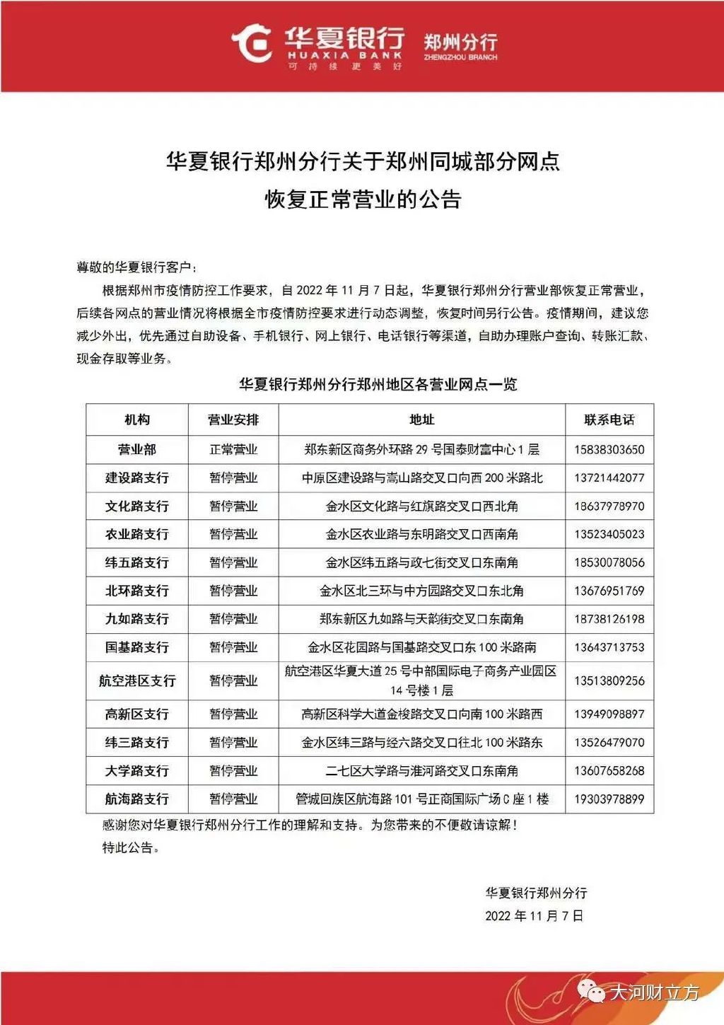 记者了解到,中原银行、郑州银行、工行郑州分行、交通银行河南省分行等多家银行的部分网点也已于11月7日开门营业。