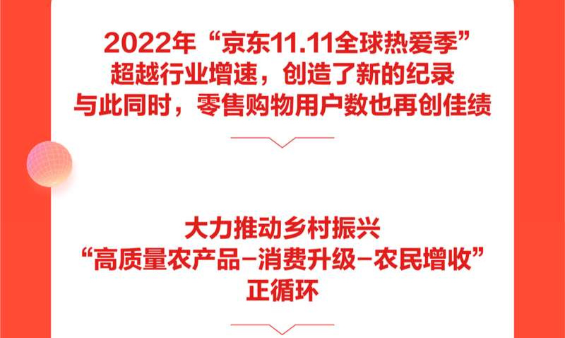 对于双十一的成绩,京东官方是这么说的:“2022年‘京东11.11全球热爱季’超越行业增速,创造了新的纪录,与此同时,零售购物用户数也再创佳绩。”语焉不详,只能理解为还有增长。