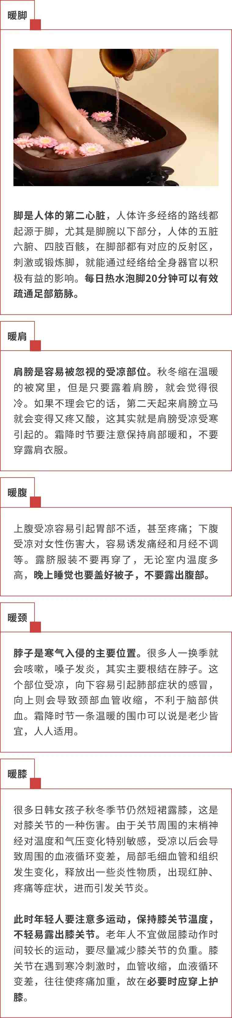霜降养生首先要重视保暖。深秋时节,风大转凉,不是人人都适合“秋冻”。老年人极容易患上“老寒腿”,慢性支气管炎也容易复发或加重。对抵抗力差的老人和儿童,应及时关注天气,添衣保暖,以免湿邪、寒邪入侵,导致生病。