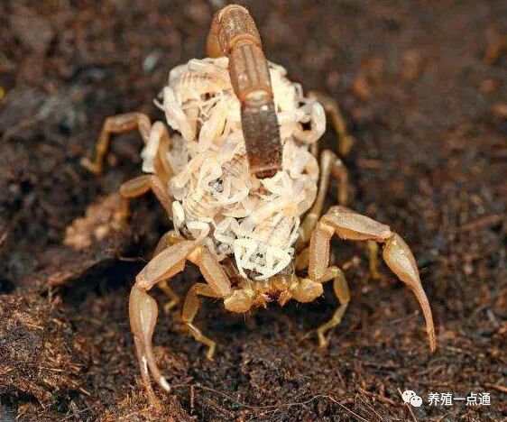 母蝎生产幼蝎后,会一直背于背部。待幼蝎蜕皮变成黑色,用鸡毛从母蝎背上扫下幼蝎,分离母仔蝎,以避免出现母蝎幼蝎互吃的状况。