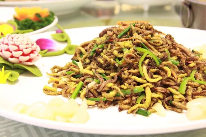 七彩炒禾虫:为了使禾虫吃起来香醇可口,在炒之前先把禾虫在油锅里爆一会,再到锅上炒熟,再配以猪肉丝、灯笼椒丝、姜葱等多种食材,口感丰富,齿颊留香。