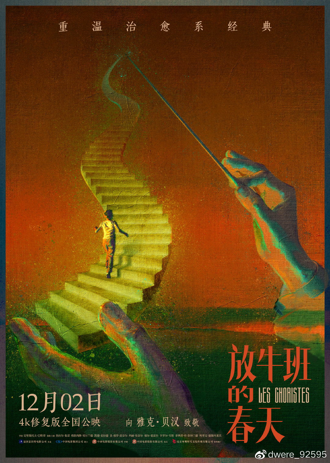电影《放牛班的春天》由法国盖拉特电影公司出品,中国电影集团公司进口,中国电影股份有限公司译制,中国电影股份有限公司发行,北京环鹰时代文化传媒有限公司协助推广。电影《放牛班的春天》4K高清修复版将于12月02日全国上映。寒冬之时,让我们唤醒心中那份沉睡的“春天”吧!