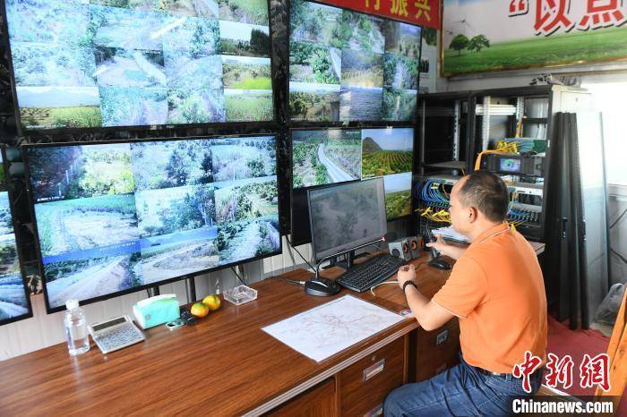 果园负责人王斌正通过屏幕监控果园安防情况和采摘工人工作情况。 蒋雪林 摄