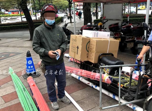 驾驶“大力王”超载被交警拦下10月25日上午,在人民中路与民主中路交会处红绿灯路口,玉林市公安局交通警察支队直属一大队民辅警开展集中查处“大力神”电动车行动。9时39分,一辆“大力神”经过路口,该车后座、踏板和车篓内装满了各种装修配件,电动车车身两旁绑满了各种各样3米长的塑料水管。