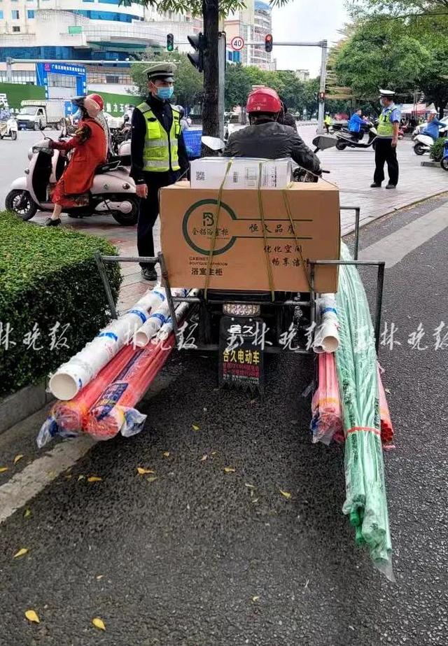 民警依法对车辆进行暂扣民警介绍,上午就查处了13辆存在交通违法行为的“大力神”,按照《广西壮族自治区电动自行车机动轮椅车管理办法》相关规定,电动车载物高度从地面算起不得超过1.5米,宽度左右各不得超出车把15厘米,长度前端不得超出车轮,后端不得超出车身30厘米,“否则就属于违规载物,按照相关规定将处以50元的罚款。”