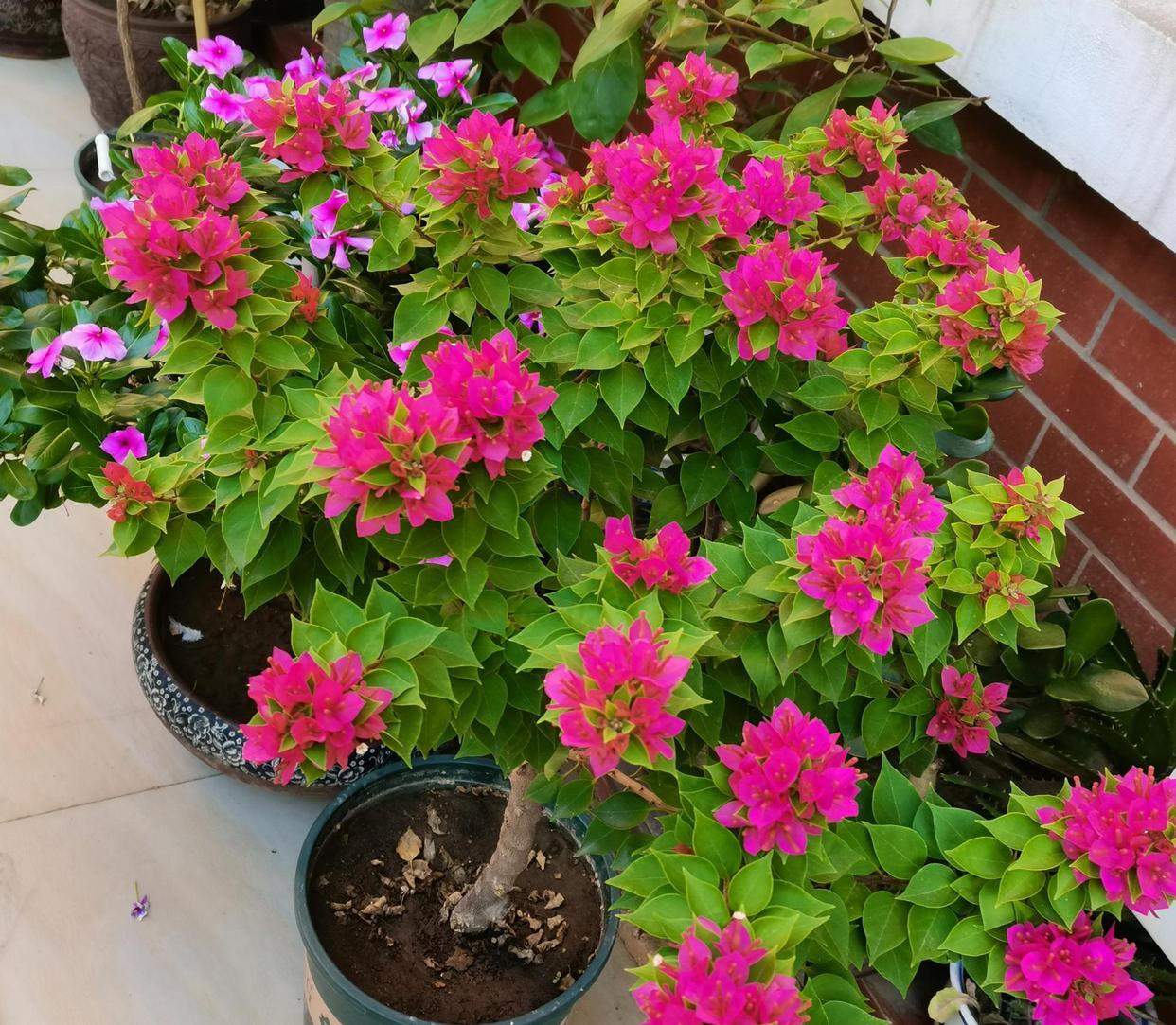 我个人认为盆栽的三角梅,比地栽更容易开花,因为三角梅在稍旱一些更容易开花,南方地区,雨水多,地栽的三角梅,反而不易开花,而盆栽的我们可以通过控水来促花,方法得当,能收到极好的效果。