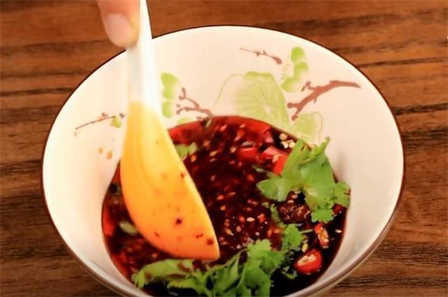 6.碗中放蒜末和小米辣,葱花和香菜,2勺生抽,2勺陈醋,再加2勺辣椒油。