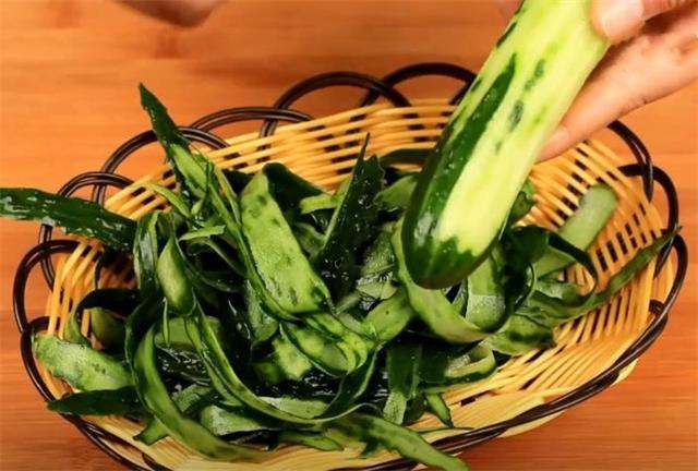1.先准备3根洗净的黄瓜,然后把黄瓜皮削下来。