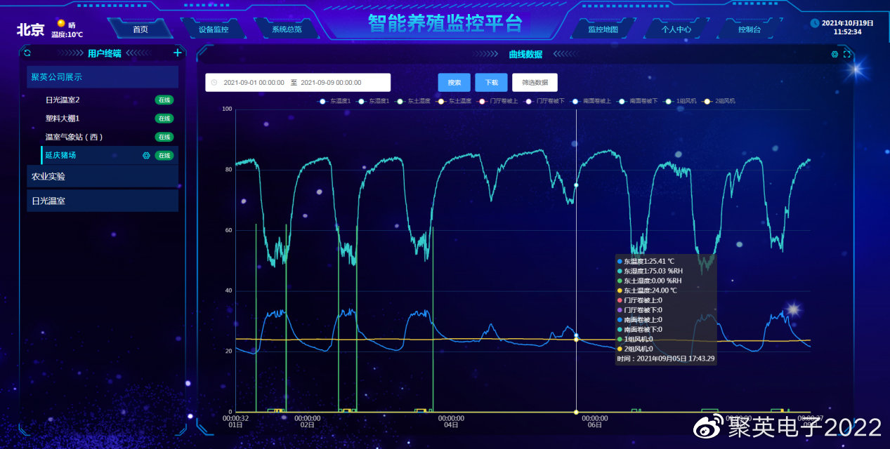 2、实时反馈:管理者可以通过PC或手机APP的云平台,实时查看养殖场环境参数的实时值,以曲线图、数据表格形式呈现;