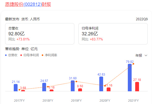 2022年前三季度公司营收92.8亿元,同比增长73.81%;归母净利润32.26亿元,同比增长83.77%。