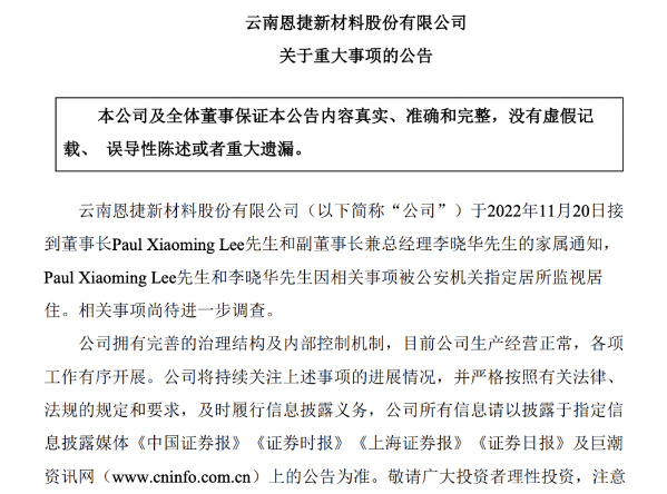 于11月20日接到董事长paul Xiaoming Lee(李晓明)及副董事长李晓华家属通知,二人因相关事项被公安机关指定居所监视居住。