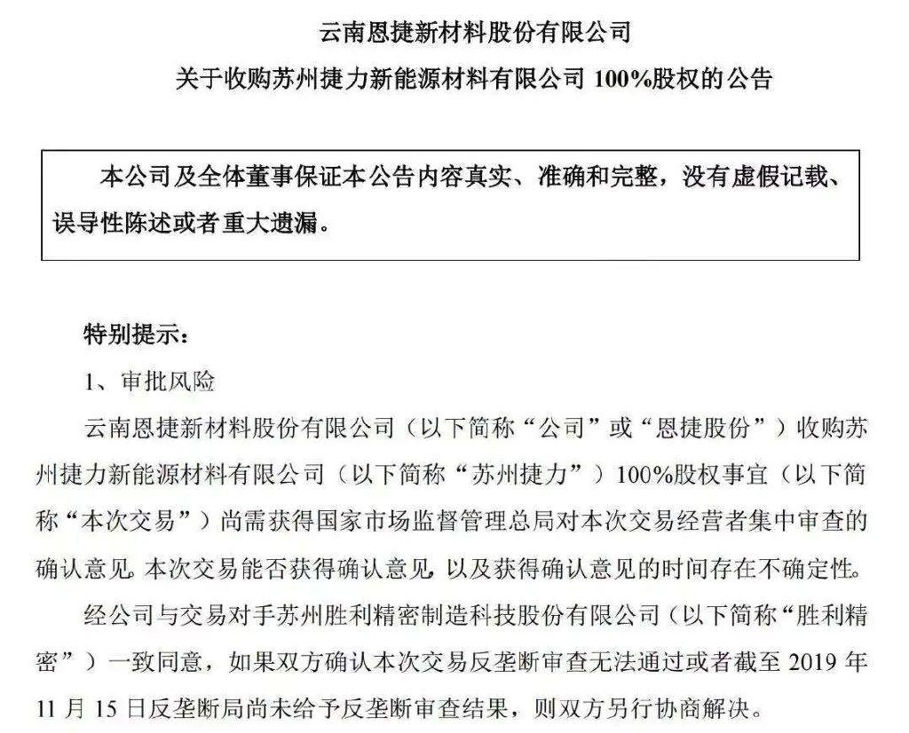 2019年8月恩捷股份公告拟收购胜利精密持有的苏州捷力100%股权,今年7月6号证监会审核通过。