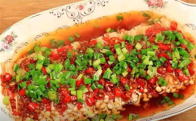 9.蒸熟出锅,撒上葱花,淋点蒸鱼豉油,浇上热油,金针菇这样做出来香辣美味,非常过瘾,简单又好吃。