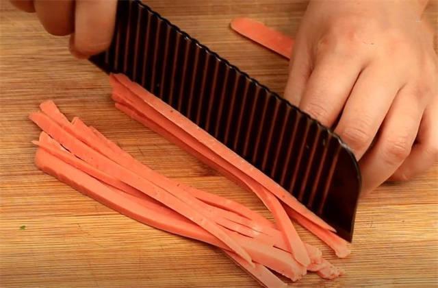 6.把金针菇摆到盘中,摆上火腿肠,再摆上一层金针菇。