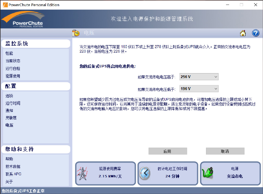 我安装PCPE的目的其实是调整电压设置,默认是当交流市电的电压下降至160 伏以下或上升至278伏以上时后备式UPS才会介入。我觉得这个范围对于深圳的电网来说有点太宽了,基本上不可能遇,手动调整成能设置的最小范围,即低于196伏和高于256伏▽▼