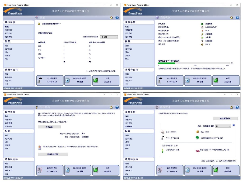 先吐槽一下,PCPE的软件UI也过于复古了,仿佛回到了零几年的时候。由于第一天使用,PCPE里的UPS状态是不完整的,比如说能源使用记录这块,需要正常运行一天后才会有准确的数据▽▼