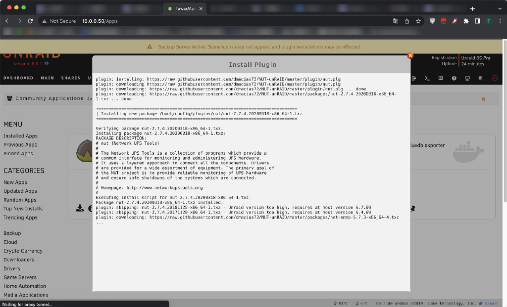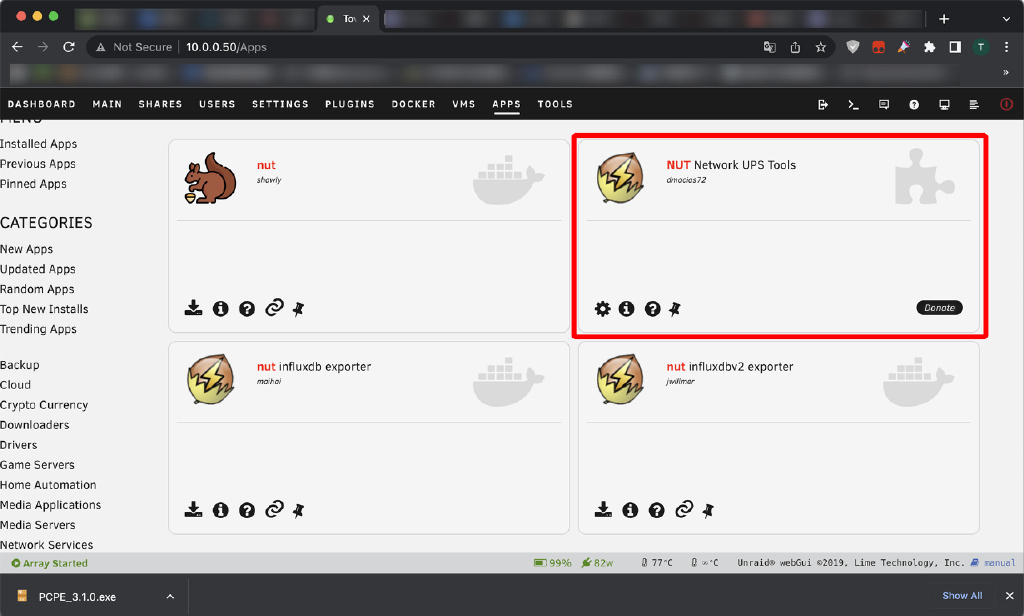 Unraid系统自带一个叫UPS Settings的功能,可以连接UPS的相关功能,比如自动关机等。但由于我是Unraid+虚拟群晖的DIY机器,要想用一个UPS控制两个平台,就需要第三方的插件支持,这个插件就是“NUT Network UPS Tools”,我们可以在“APPS”里进行搜索和安装▽▼