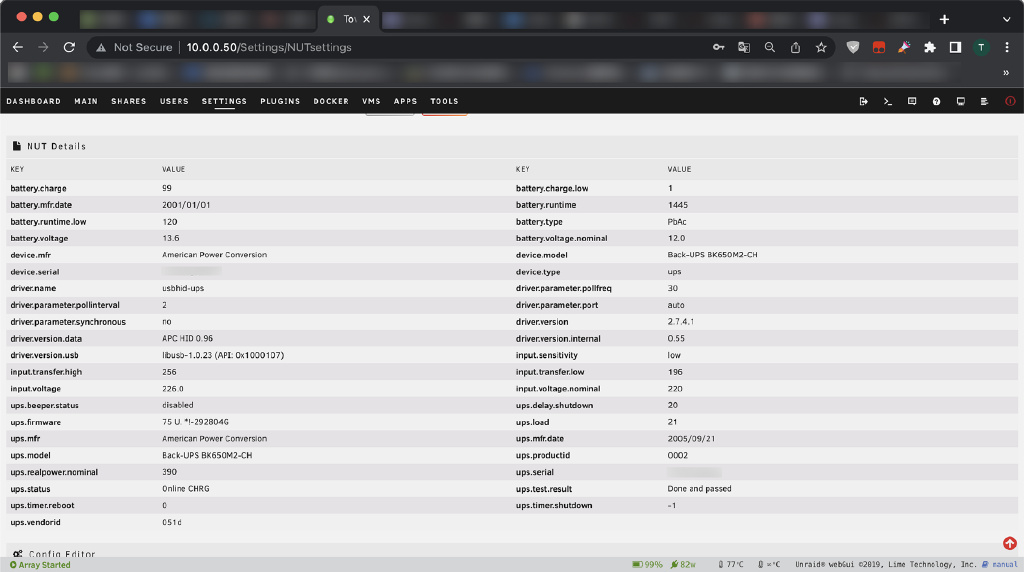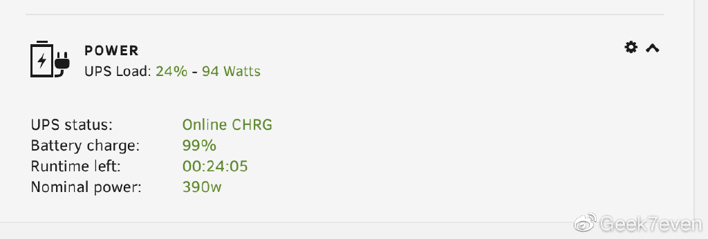 配置完成后,在Unraid的“DASHBOARD”里就能看到UPS的相关动态了,电池容量和预计可供电时间等一清二楚▽▼