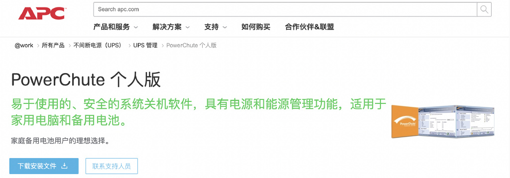 APC的UPS是有专用的个人管理软件,在官网上就能下载,名字叫PowerChute Person Edition(PCPE),可惜仅支持Windows版▽▼