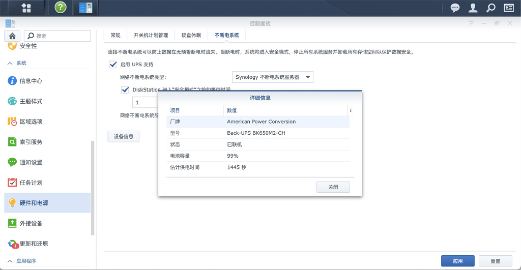 UPS是爽玩NAS的最后一步,也是保证数据安全的有力手段,推荐大家都入一个。虽然我买的是APC的BK650M2-CH,但其实啥牌子的产品都差不多,只要兼容性OK,产品的外观你喜欢就行了,也没必要非得抄什么大神的作业。这里面最关键的是购买安装之后的设置,有效的设置才能发挥UPS的全部价值,而不是多了几十分钟的电池而已