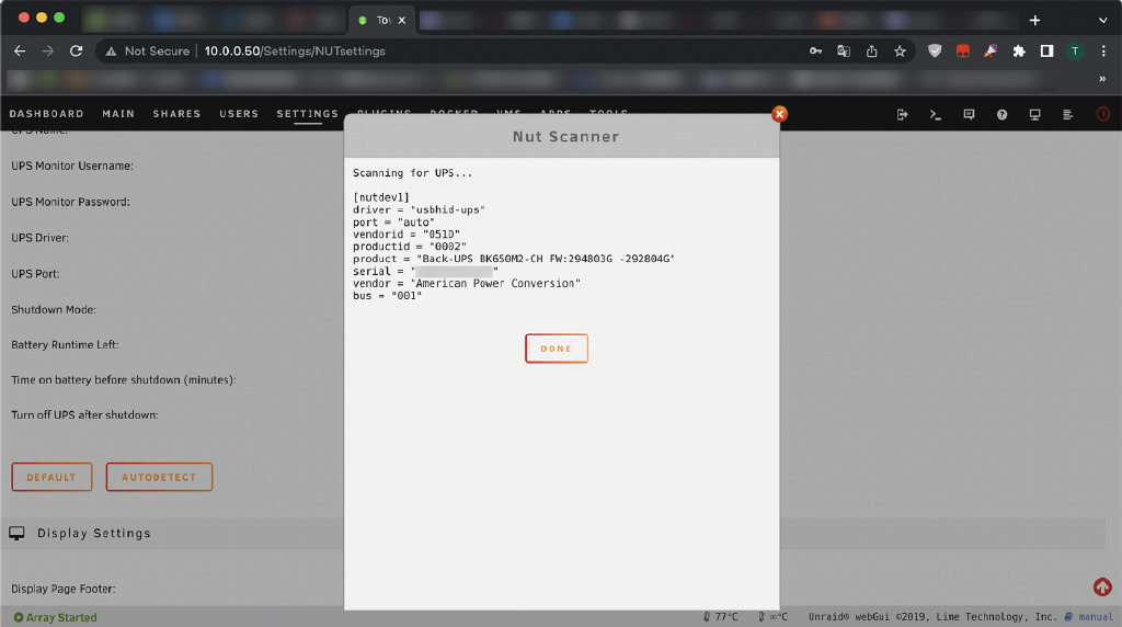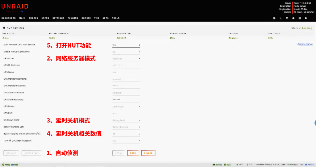 安装完成后,我们来到“SETTINGS”页面,找到“System Settings”下的“NUT Settings”功能,就是那一个电池ICON的按钮,点进去。里面的选项暂时不用管,我们直接找到“AUTODETECT”这个按钮,点击一下,让插件侦测UPS进行自动配置,在自动配置前忘记截图了,所以这功能有没有用不大清楚,大家跟着做就行▽▼