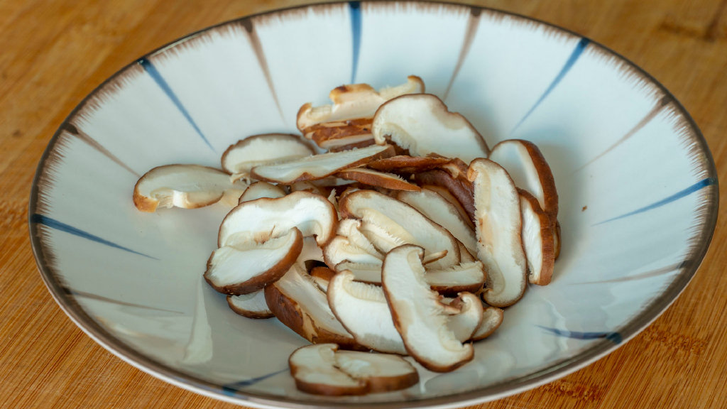 5、再把胡萝卜、香菇、玉米、豌豆也倒进来,炒一炒后会更香,盛出来后先放在一旁。