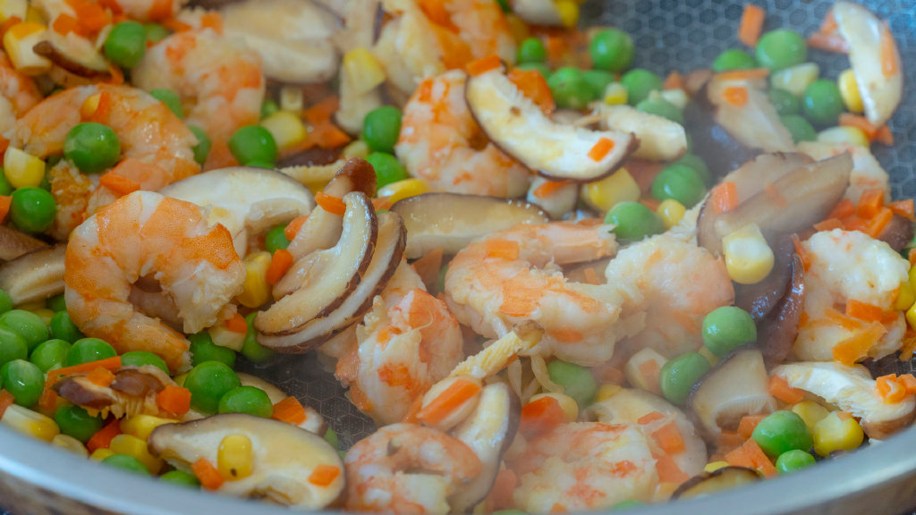 3、再来一把玉米粒、一把豌豆、适量的虾仁。