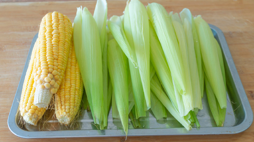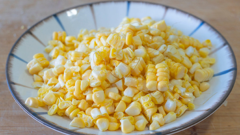 2、接着来处理玉米,玉米从中间一分为二,然后再用刀把玉米粒削下来。