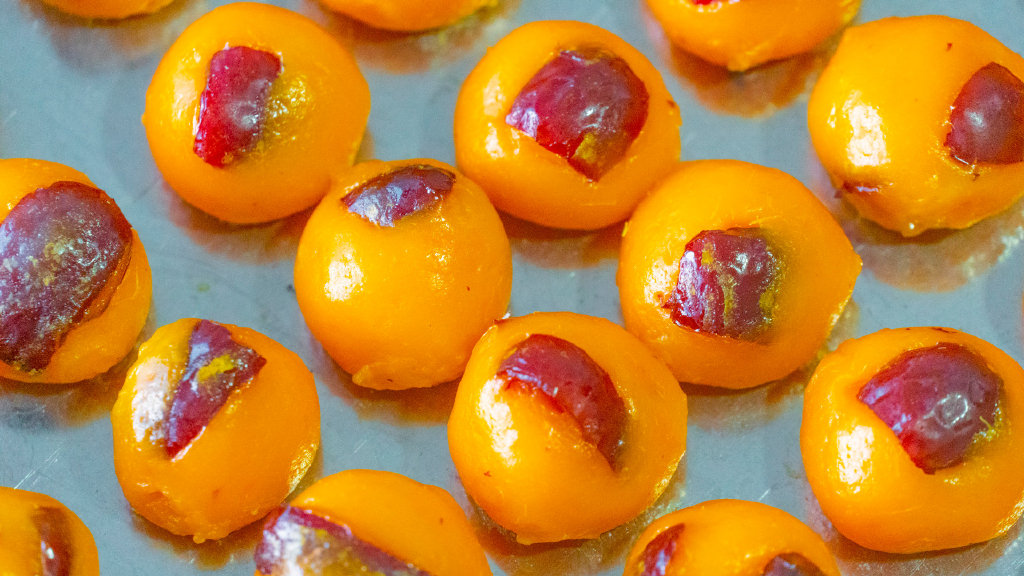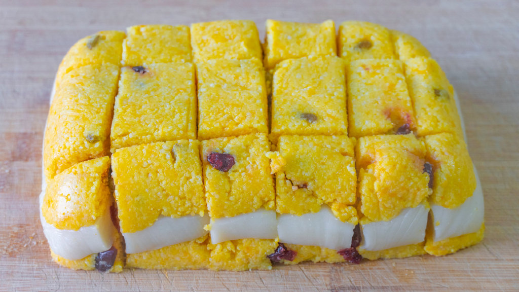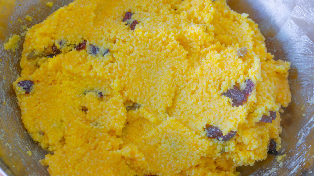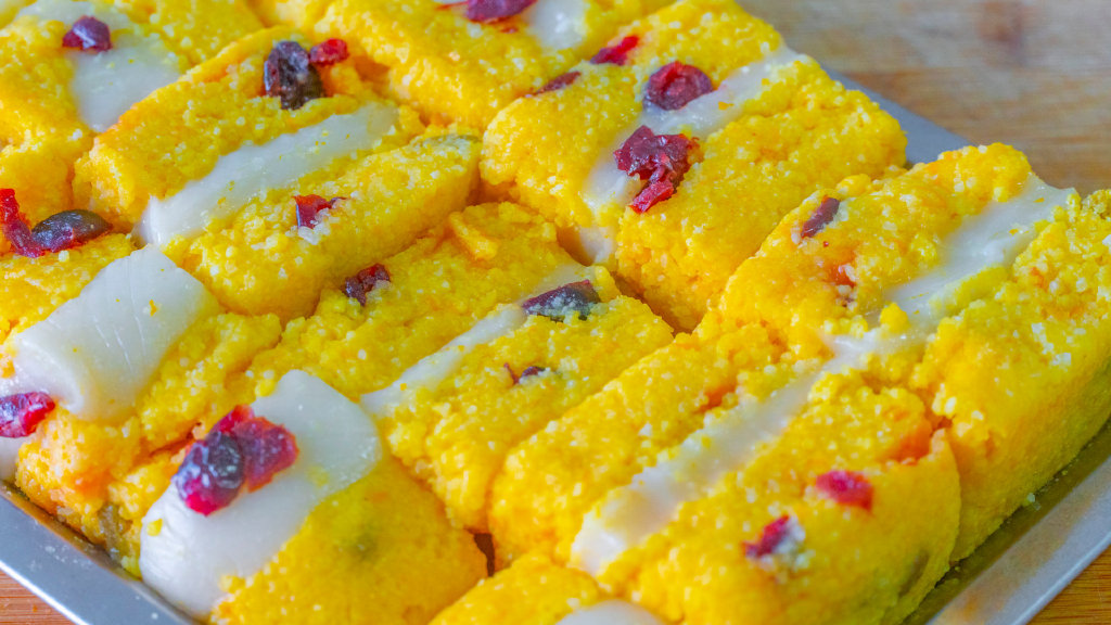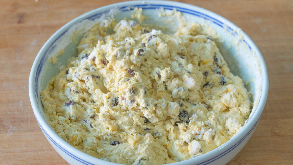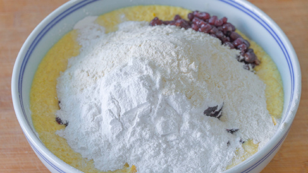 食材:玉米三根、100克蔓越莓干、100克蜜红豆、400克糯米粉、50克黄米面