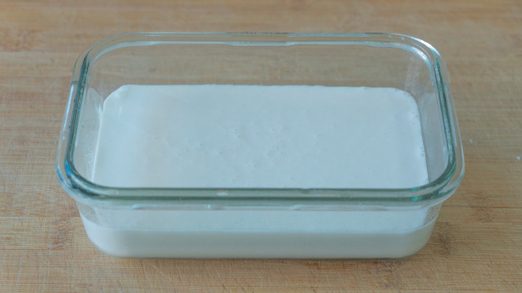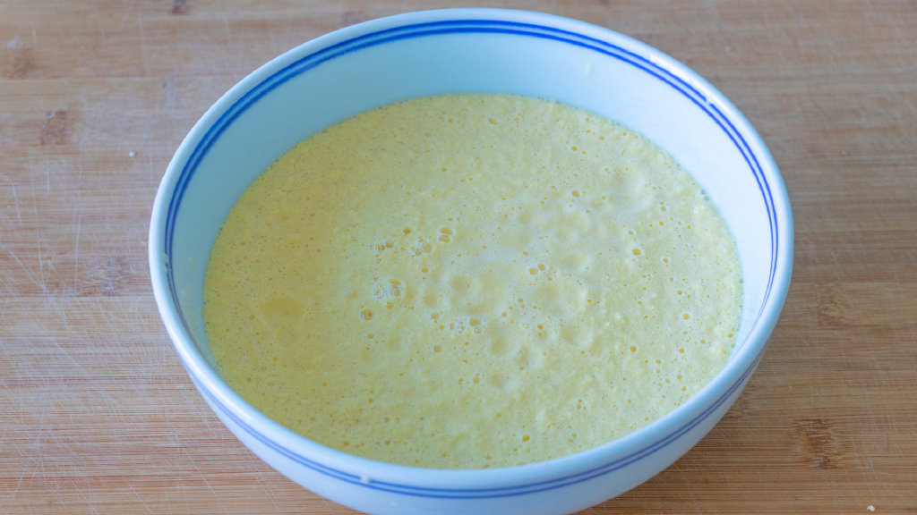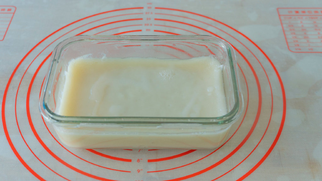 5、然后再加200克清水,继续搅拌均匀,搅拌成没有面粉疙瘩的细腻面糊就行,然后倒入容器里,盖上保鲜膜扎孔。