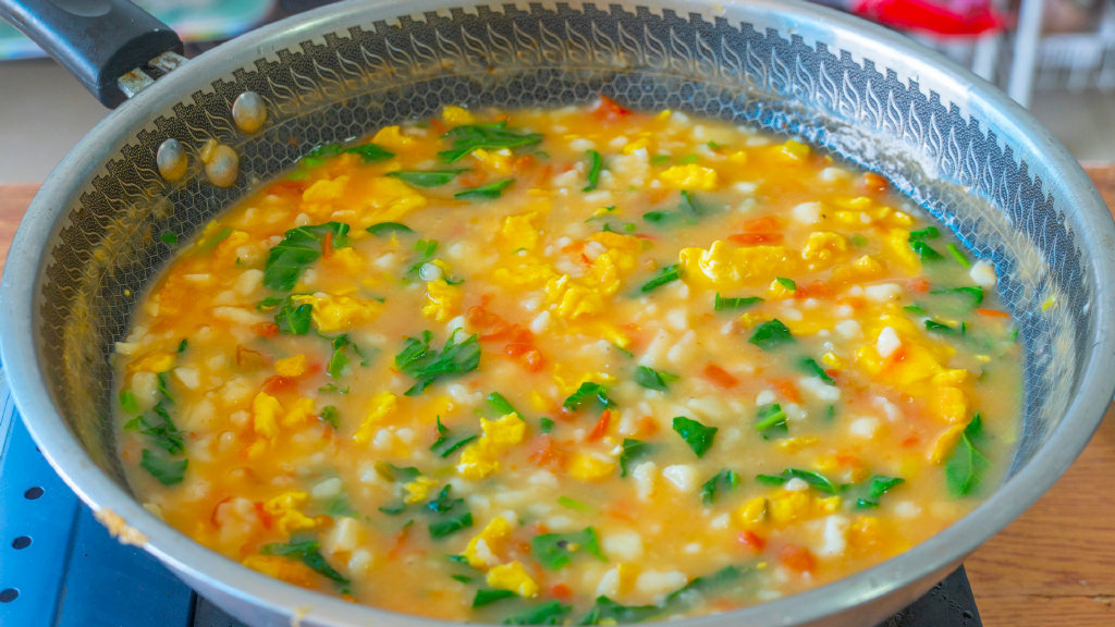 9、然后下入山药面疙瘩,开中火继续煮5分钟,接着倒入鸡蛋拌匀。