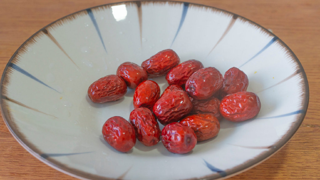 3、蒸红薯的时间我们准备一把红枣,先加水清洗干净,然后再泡5分钟,泡好后控一控水分,然后再用剪刀把红枣肉剪成小块儿,剪好后先放一旁备用。