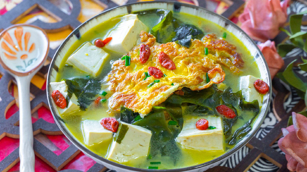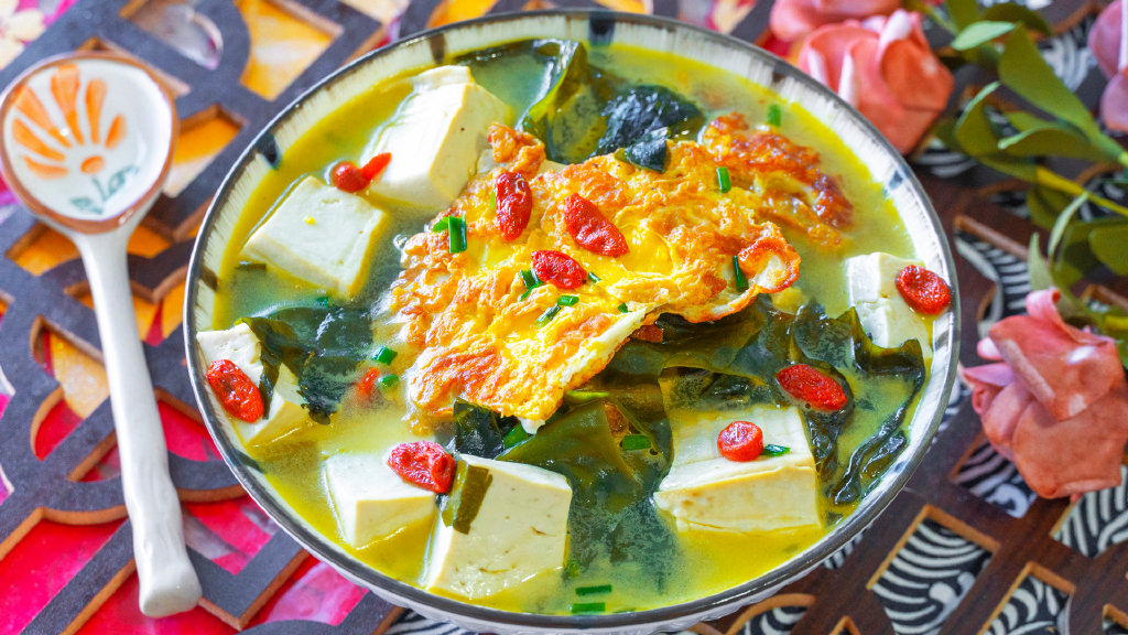 10、再继续倒回锅中,加裙带菜、鸡蛋、豆腐煮5分钟,煮好后加盐、胡椒粉调味儿。
