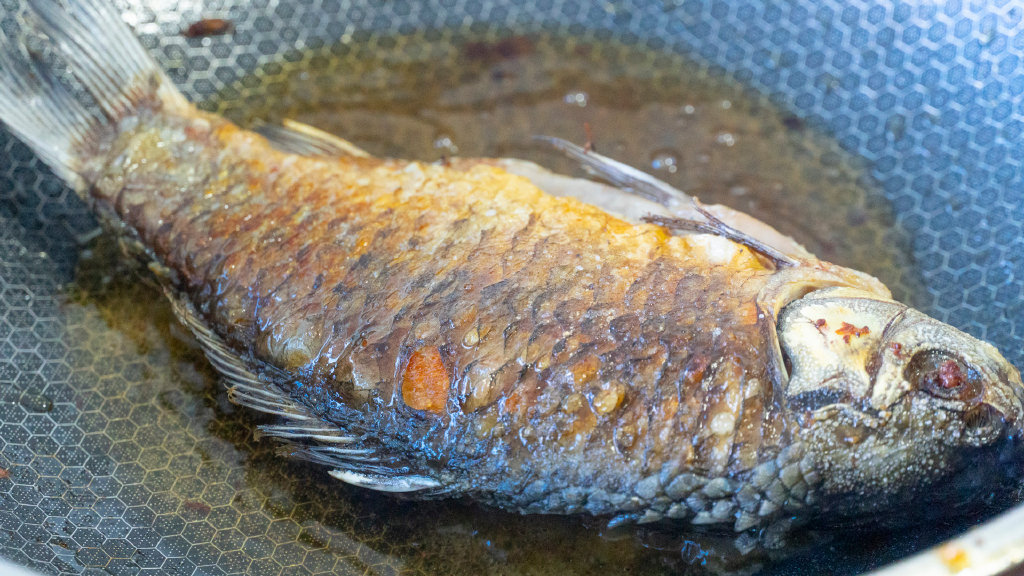 6、锅里继续倒油,放入鲫鱼煎,一面煎得金黄后翻煎另一面。