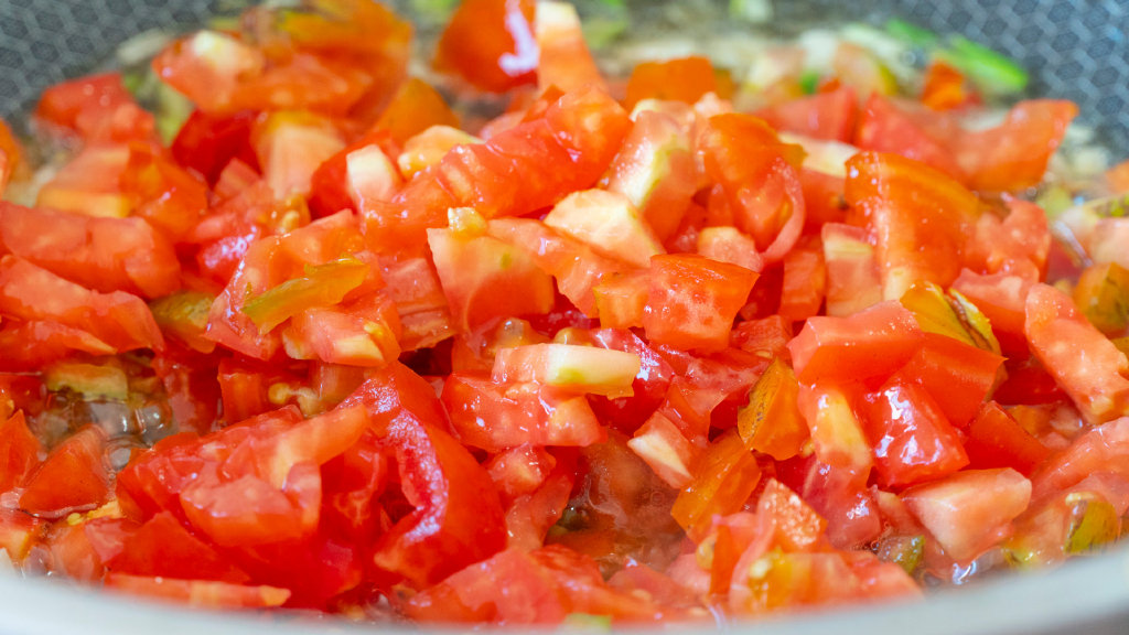7、继续起锅倒油,加葱蒜爆香,然后倒入西红柿丁,加一勺盐更容易出汁儿,大火继续翻炒。