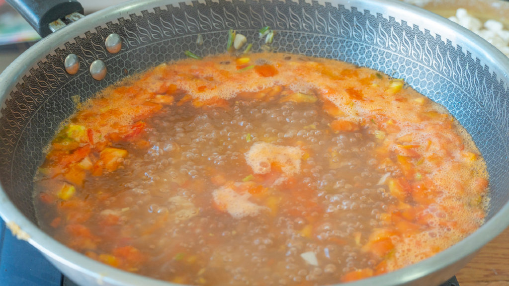 8、炒出汁水后倒入一大碗清水,盖上盖子后大火煮开。