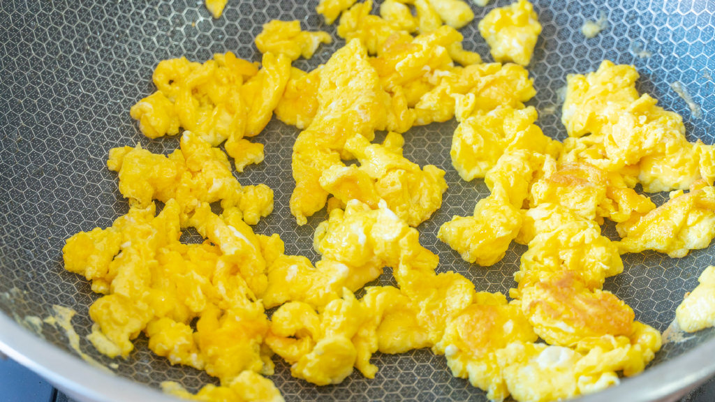 6、起锅倒油,倒入蛋液,蛋液开始凝固的时候用筷子滑散,可以多煎一会儿,个人觉得鸡蛋煎老一点会更香,煎好后先倒出来。