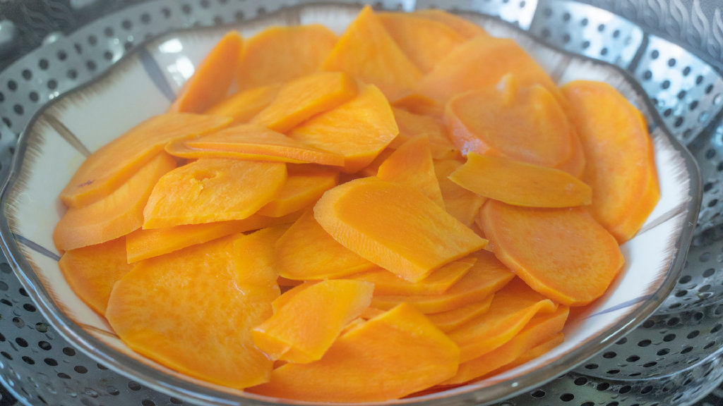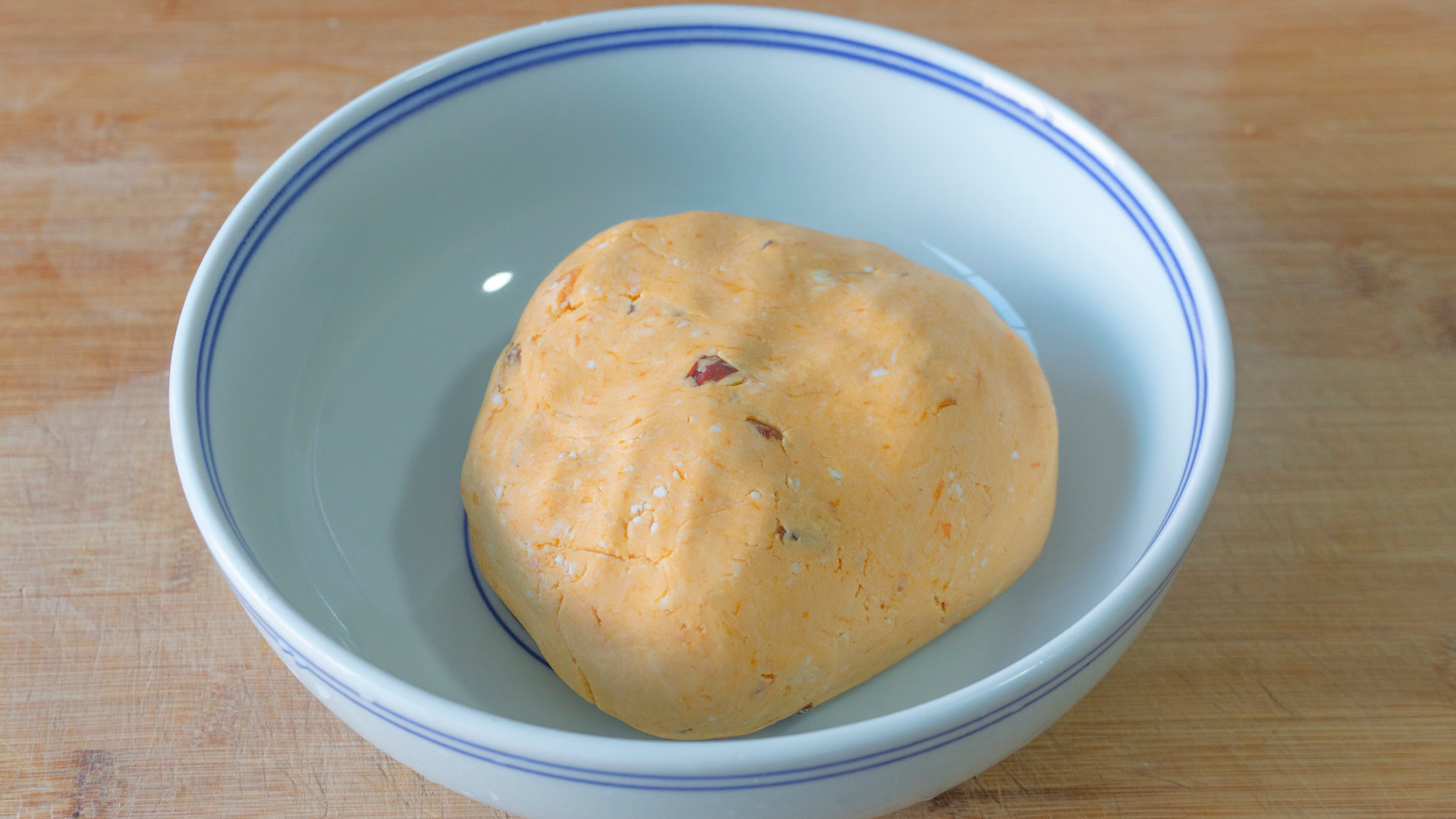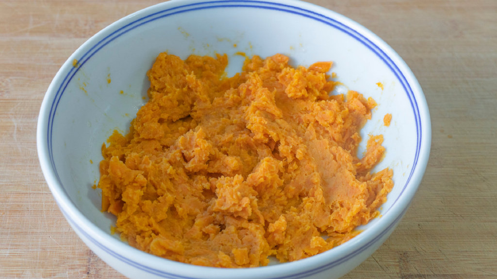 4、红薯蒸熟后用筷子能轻松插透就行了,关火后取出倒入大碗里,趁热捣成红薯泥。